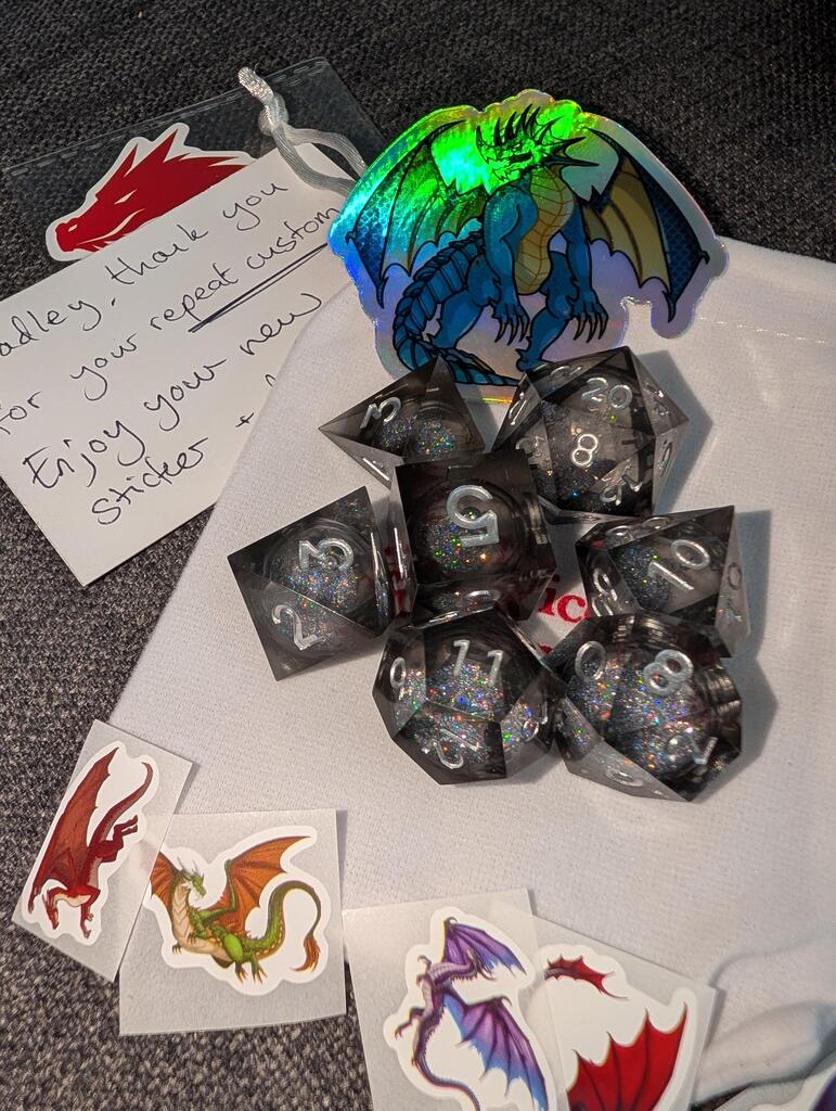 "Top seller! The dice are fantastic, the bag is fantastic, the little stickers are great, and the fact I got a hand written card topped it off. I'm so happy, thank you so much."