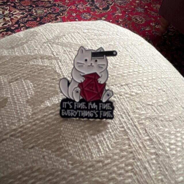 Our It's Fine Nat 1 Cat Pin features a cute cat design that perfectly captures those moments when your dice rolls don't go your way, and you roll a natural 1. This pin is a fun way to embrace the ups and downs of tabletop gaming.